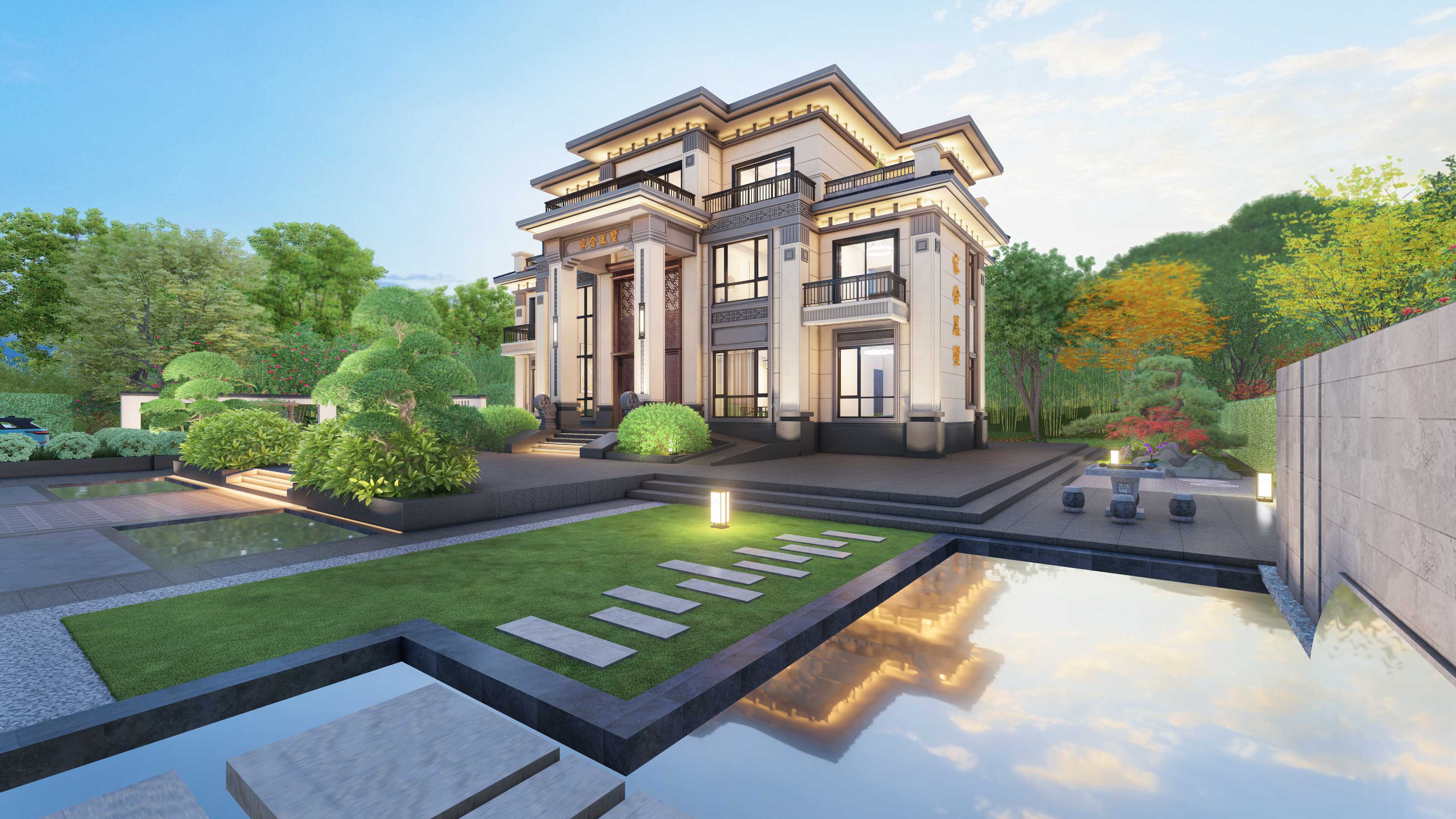 新中式二层四开间农村自建别墅 独立挑空客厅 空中花园